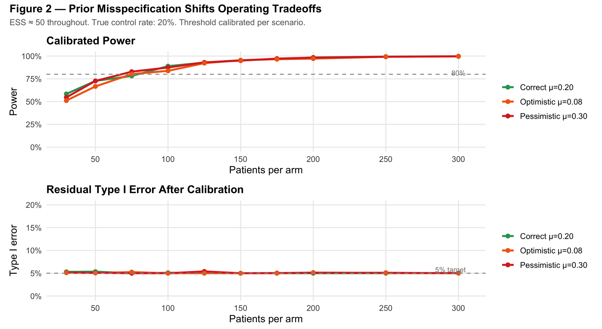 Because calibration is done per-scenario, calibration largely absorbs the Type I error distortion that prior misspecification would otherwise introduce. The more consequential operating differences show up in the calibrated threshold and in power:
