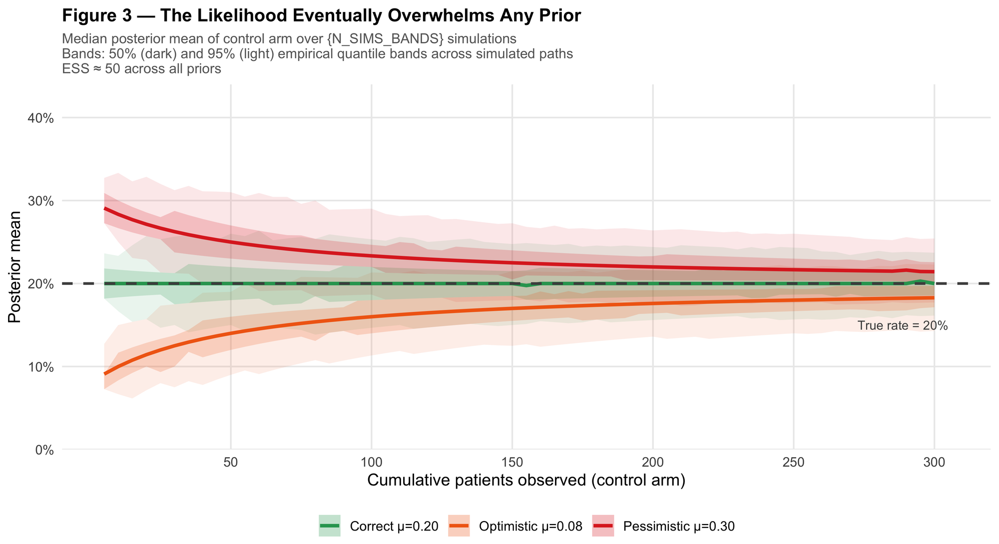 This is not a guarantee: it's a property that holds in large enough samples, for the priors and sample sizes studied here. But it is a meaningful reassurance: a well-designed trial doesn't depend on the prior being exactly right. It depends on the prior being reasonable, and the data being sufficient to correct it if it isn't.