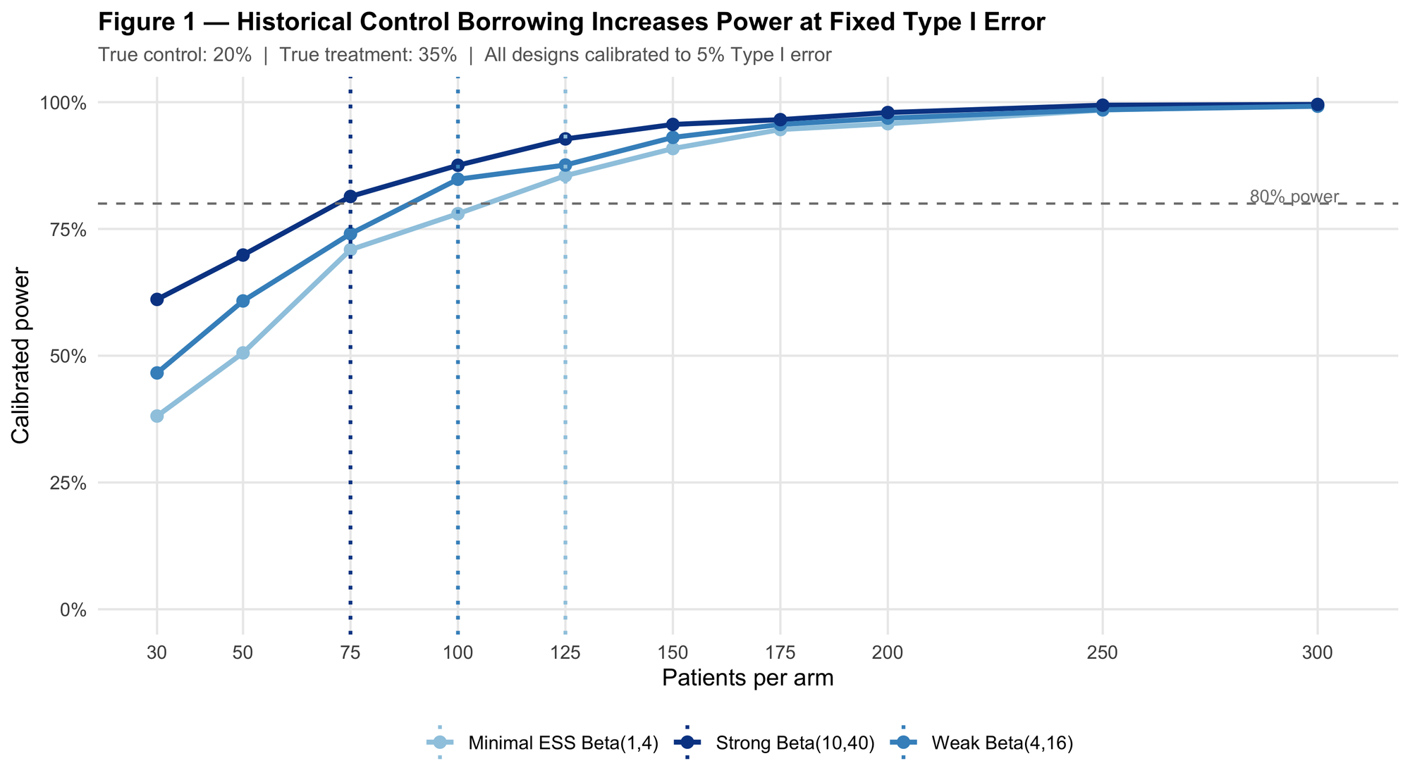 The strong prior (ESS = 50) reaches 80% power at N = 75 patients per arm. The minimal-ESS prior needs N = 125 patients per arm for the same target. That's 100 fewer patients randomized, all from encoding roughly 50 patients of historical control data at the correct rate.