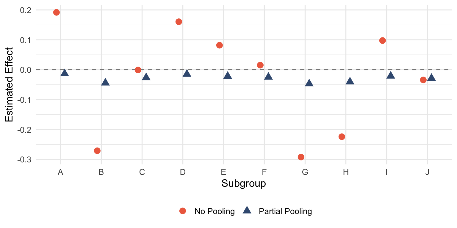 Rather than testing each subgroup independently, Bayesian hierarchical models treat subgroup effects as drawn from a common distribution. Extreme estimates get pulled toward the overall mean—shrinkage—reflecting the prior belief that subgroups probably aren’t wildly different from each other.