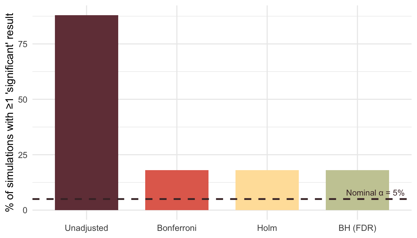 Even Bonferroni—blunt as it is—brings the false positive rate back to earth.