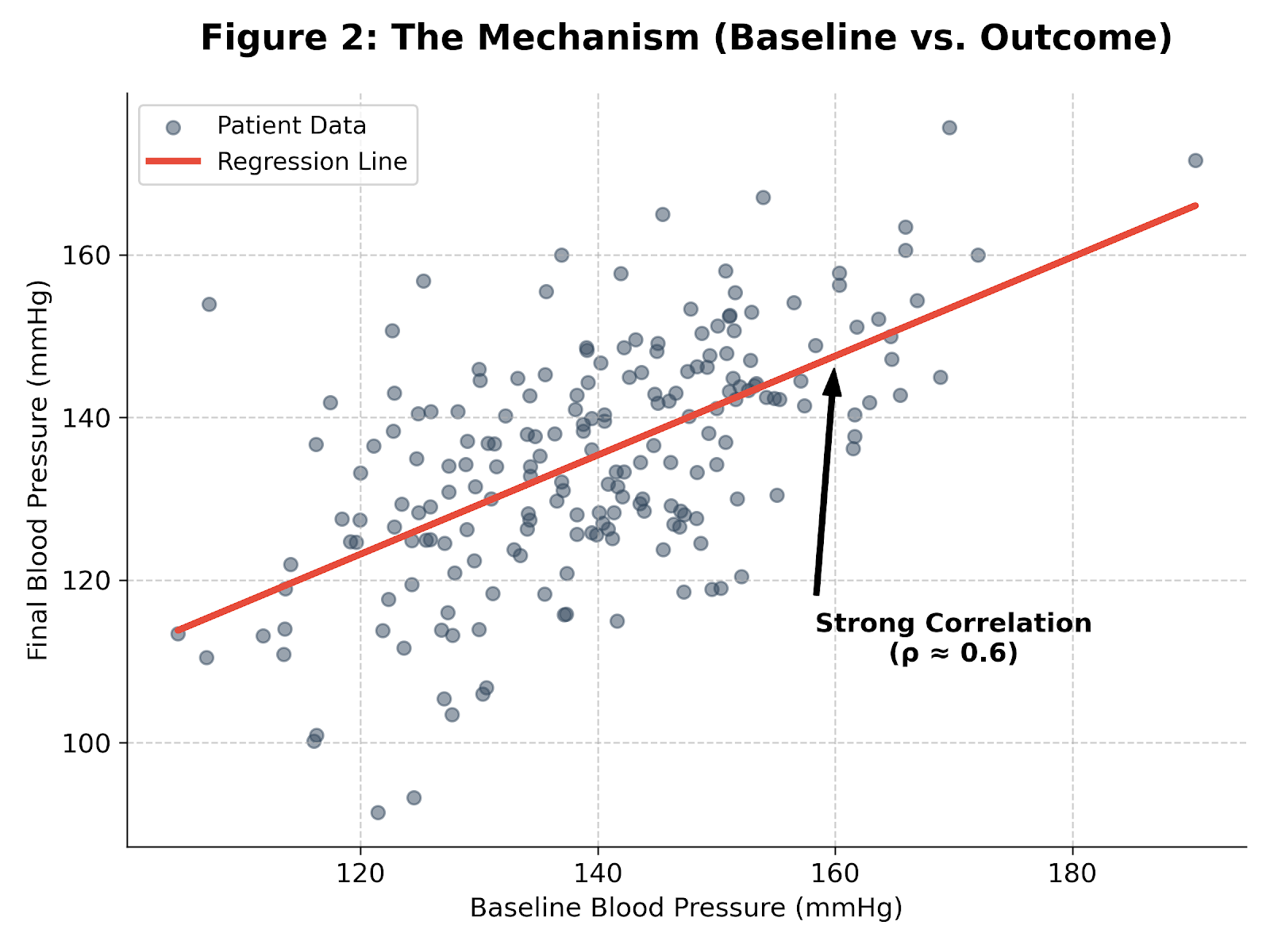 Baseline blood pressure is strongly correlated with the final measurement (ρ ≈ 0.6). Accounting for that variance reduction during planning: